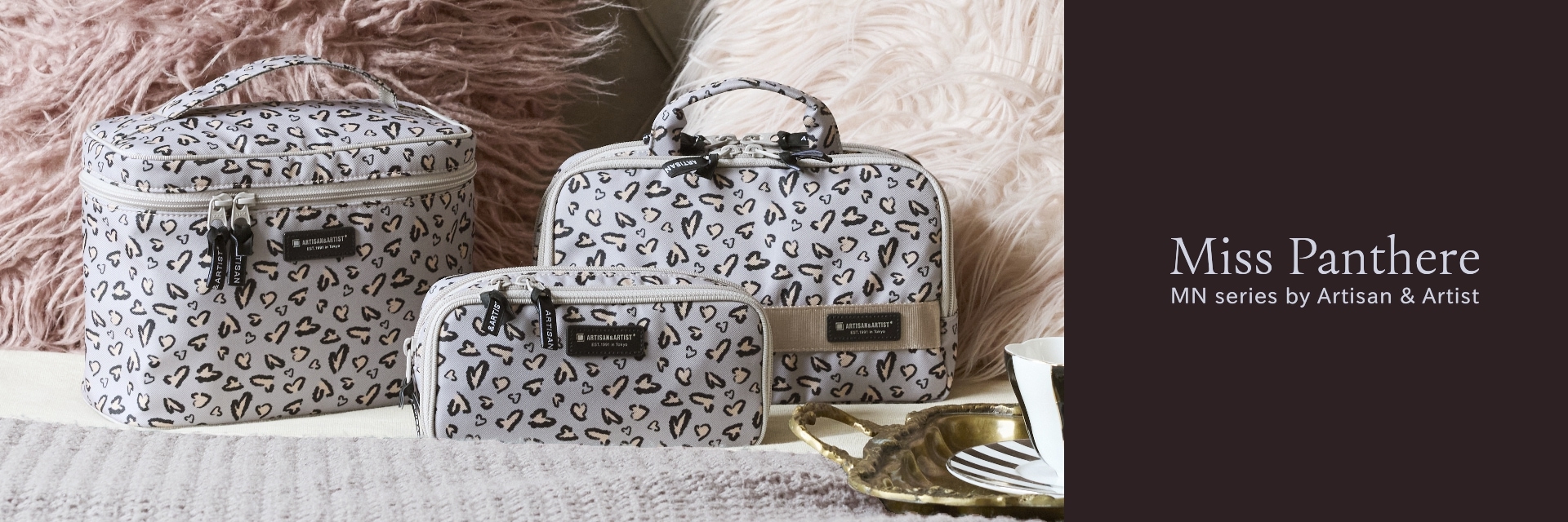 淡いグレーベースに小粒レオパード×ハート柄をあしらった、甘すぎない・強すぎない絶妙バランスのポーチシリーズ。バッグの中でさりげないアクセントになり、普段使いでも旅行でも使いやすいアイテムです。